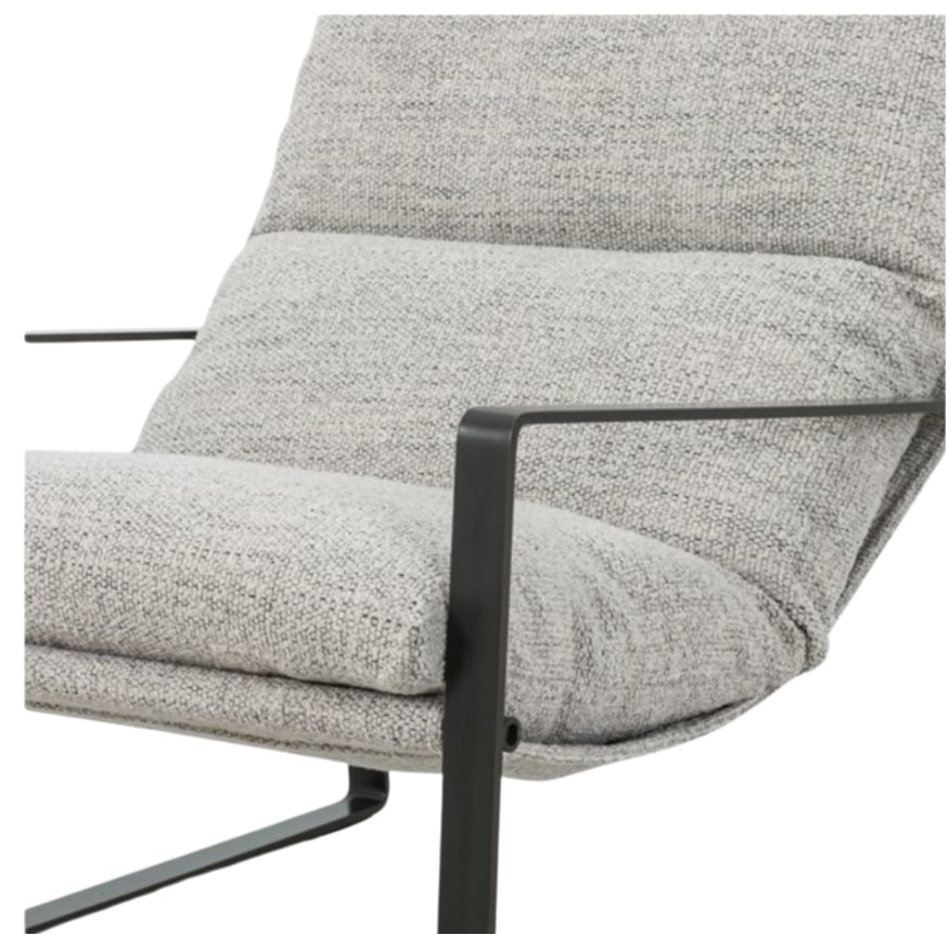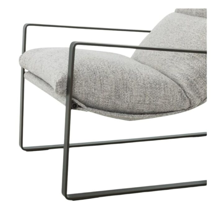Effortlessly cool and super stylish, this sling-style chair in light grey upholstery brings a modern twist to a classic design. With industrial iron framing, it adds a touch of drama. Perfect for staging, it instantly elevates any space with its contemporary flair and visual interest.