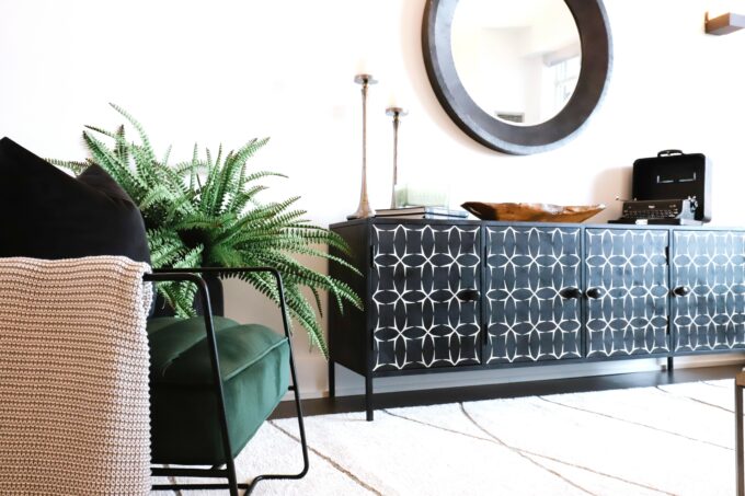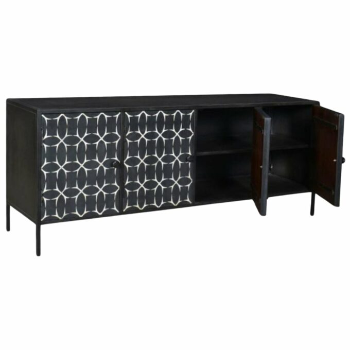 The Bellatrix sideboard captivates with its moody and complex character, truly a showstopper in any setting. Its gunmetal frame intricately weaves a hypnotic pattern through the delicate bone inlay, instantly elevating the ambiance of any room. This piece masterfully balances masculine and feminine elements, creating a dynamic tension that draws attention and admiration repeatedly, making the Bellatrix Sideboard a memorable and cherished addition.