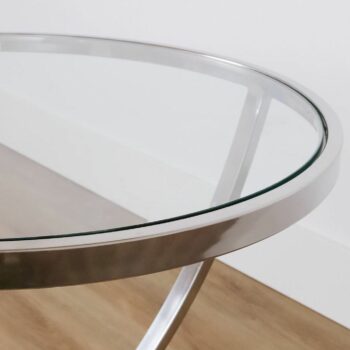 The Brielle End Table is a standout piece of mid-century modern accent furniture, boasting a circular and minimalist design with a single side bar connecting its tubular chrome frame. Its adjustable height mechanism enhances its adaptability and versatility, making it a versatile addition to any space.