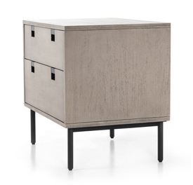 The Bronx double drawer nightstand features a clean, streamlined design that offers a structured but airy appearance to your bedside. Its grey-washed acacia veneer harmonizes perfectly with the matte iron frame, presenting a beautiful blend of natural elegance and industrial charm. This combination ensures the nightstand is both a functional piece and a stylish addition to any bedroom decor.