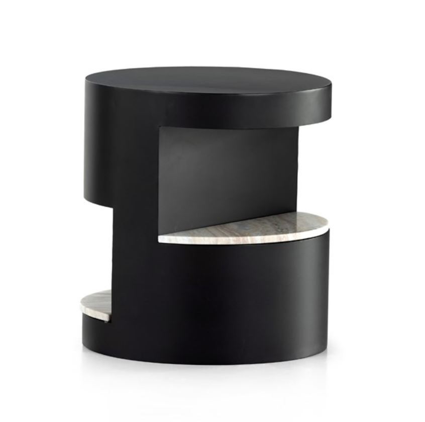 A drum-style end table crafted from dark bronzed iron features cutout shelving made of creamy taupe marble, offering a striking contrast in materials.