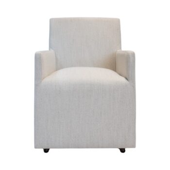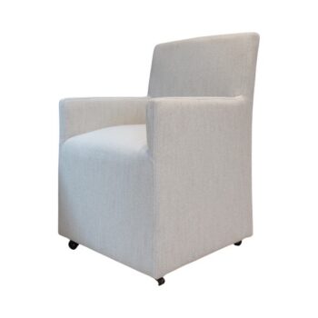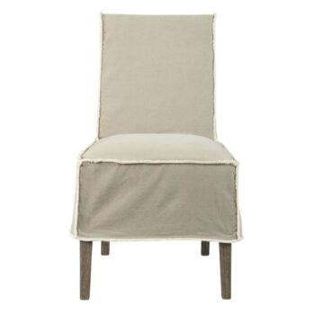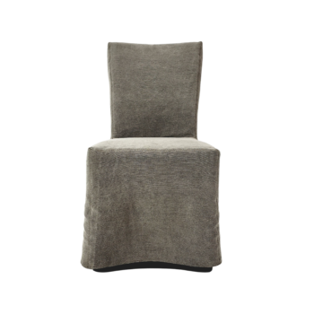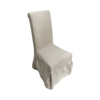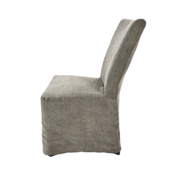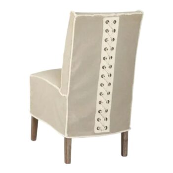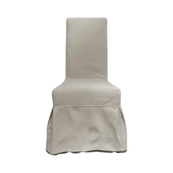 The Chapel dining chair captures attention with its slipcovered design, featuring a tall and enticingly curved silhouette dressed in elegant ivory fabric.