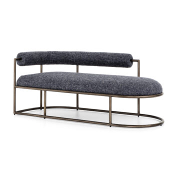 The Chevelle grey chaise showcases a unique open design, blending mixed materials for a dynamic and distinctive seating experience. Its weathered oak frame harmonizes beautifully with the tailored upholstery, offering a blend of texture and elegance. Bronze nailhead trim delicately outlines the chaise, providing the perfect finishing touch to this exquisite piece.