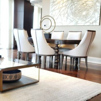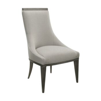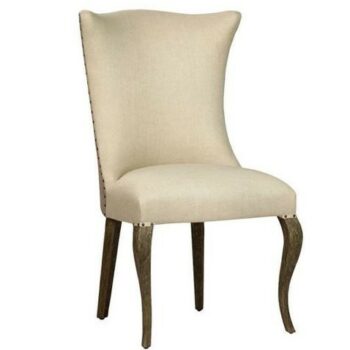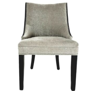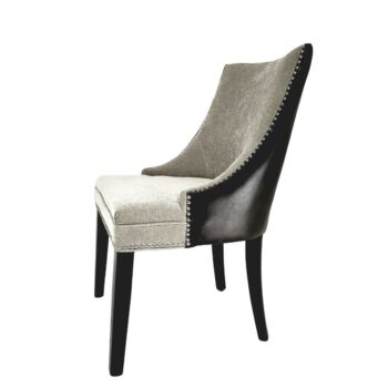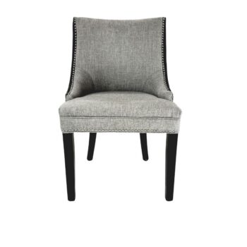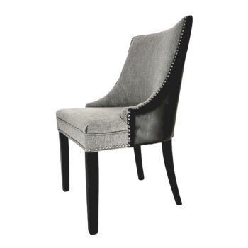 The Cromwell dining chair stands as a striking statement piece for your dining room, showcasing a softly weathered, exposed pine wood frame that’s gently washed in gray. This harmonizes with the silvery gray, faux leather back and neutral linen seat, all beautifully highlighted by nickel nail trim and metal leg tips. A polished nickel ring pull on the back adds a touch of sophistication, seamlessly blending rustic charm with modern elegance.