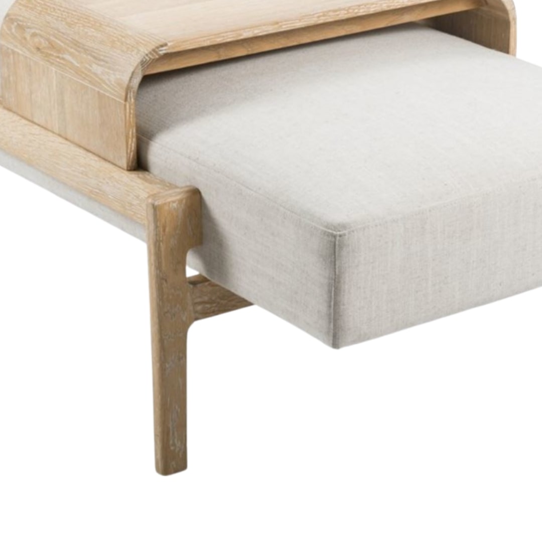 The Delamore Light Wood Bench presents a modern twist on the classic mid-century-style telephone bench. Its neutral seating is paired with a white-washed oak sliding tray, making it a versatile addition to any entryway or living room. This piece combines practicality with contemporary design, seamlessly integrating into modern interiors.