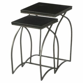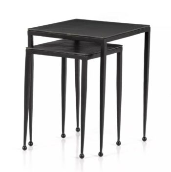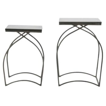 Featuring a polished marble inset top, this end table boasts a hammered iron rod frame with a blackened steel finish, adding an element of sophistication to any space. The set includes both large and small end tables, offering versatility and the option to create a nested arrangement for added visual interest and functionality.