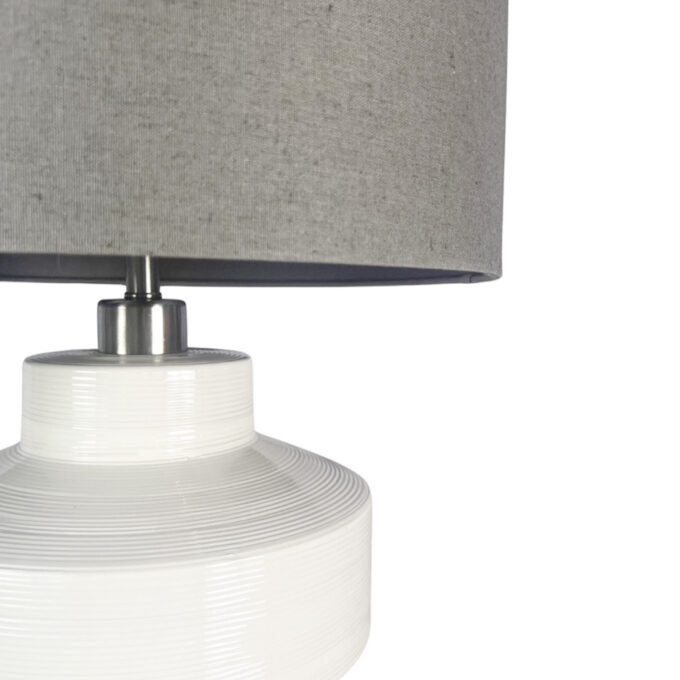 This mid-century inspired table lamp has a white ceramic base with ribbed texture and brushed nickel accents.