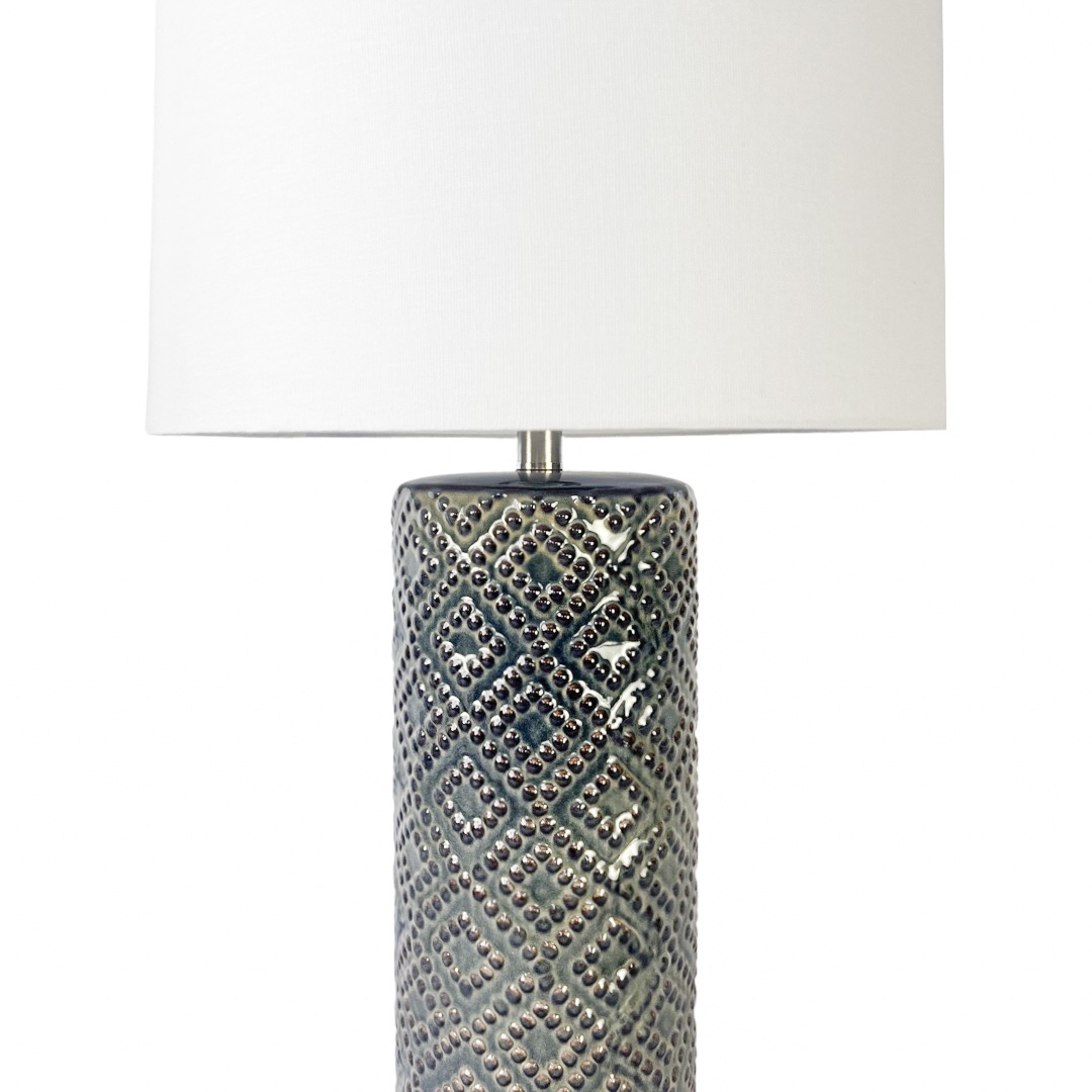 This ceramic table lamp features a repeating geometric motif finished in a mottled blue-green glaze.