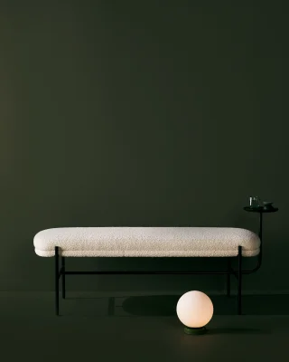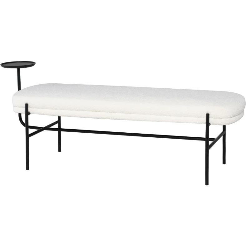 Sculptural and refined, this accent bench blends soft texture with sleek structure. Upholstered in a plush bouclé-style fabric, the rounded seat brings warmth and comfort, while the slim black metal frame adds contrast and architectural edge. The integrated side table offers a functional design detail—perfect for styling with books, décor, or a small accent piece.