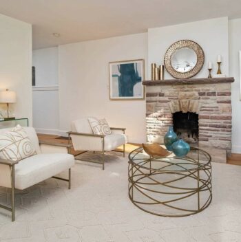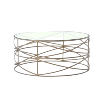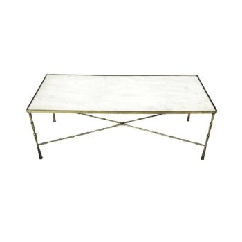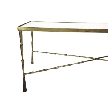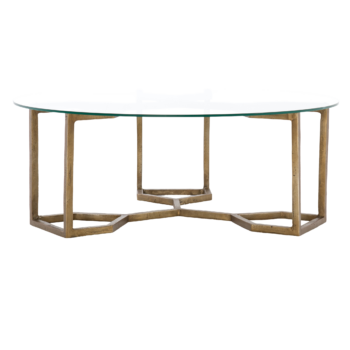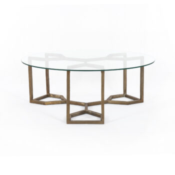 Crafted from raw brass, the mesmerizing base of this coffee table features geometric motifs that elegantly support a simple, rounded marble top. The unique design of this piece offers an open-air look, thanks to its lightness in both style and color.