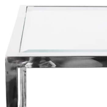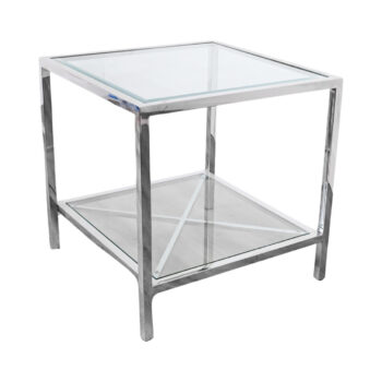 The Jude end table features a streamlined base, where the stainless steel frame boasts a high gloss chrome finish, elegantly paired with a glass top. Its contemporary, minimalist design fits perfectly next to accent chairs or in any space seeking a touch of significant style.