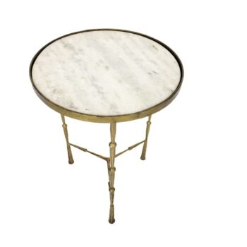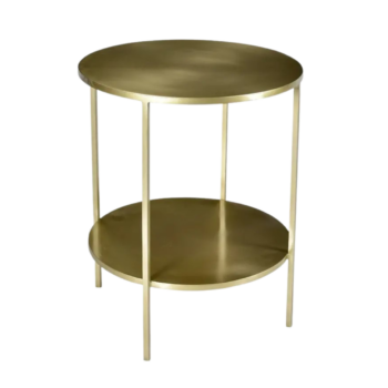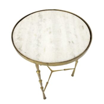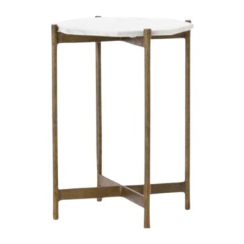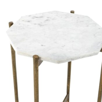 Inject a burst of elegance into any room with this chic piece. Two tiers of polished white marble provide ample, smooth shelving in an open design, offering extensive surface space. The piece is framed by a lustrous gold metal structure, adding a touch of feminine-industrial flair to its sophistication.