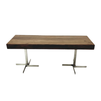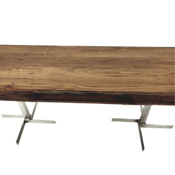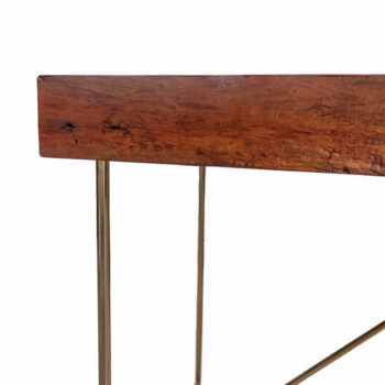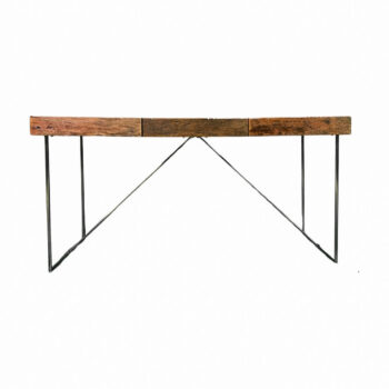 Sleek and fashionable, the Ledger desk’s delicate iron framework supports a sophisticated desktop, assembled from strips of recycled wood laid out in a precise pattern. Perfect for infusing an element of urban, farmhouse, or bohemian style, it harmoniously melds diverse design elements into a modern setting.