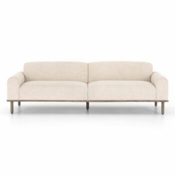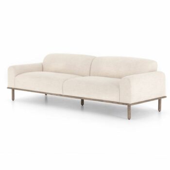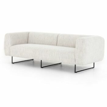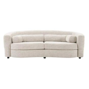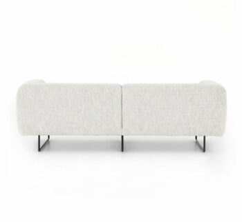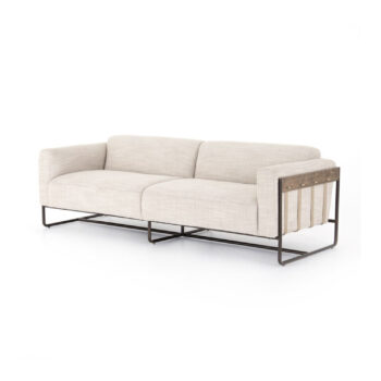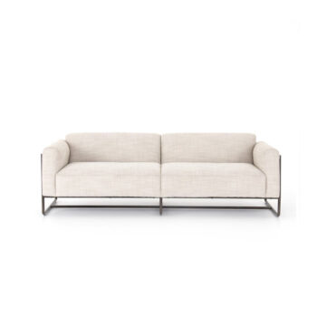 With its soft and sculptural lines, the light upholstery of the Maeve sofa is tailored to perfection. The exposed framing of grey-brushed stainless steel adds a dramatic focal point to any contemporary interior. While the sofa is wide, it is not overly deep, resulting in a look that is both substantial and inviting without overwhelming the space.