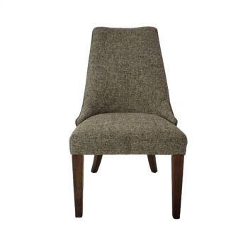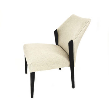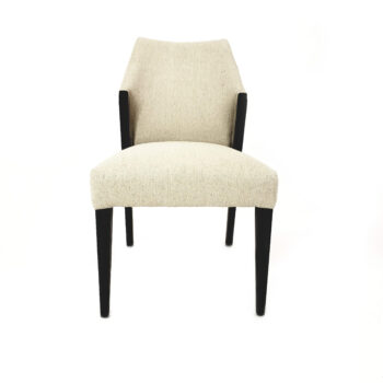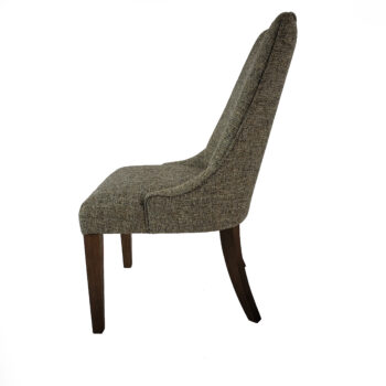 The Paula desk chair combines heathered stone seating fabric with playful ticking stripes showcased through an open-framed back, blending mid-century styling with spit-tack detailing and a richly stained birch finish for a distinctive and stylish addition to your workspace.