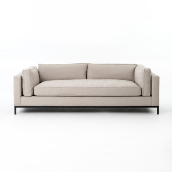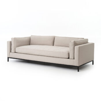 Hand tufting adds a touch of both energy and sophistication to the stone-colored fabric of this sofa, complemented by its squared-off arms. Slim gunmetal-toned legs contribute an industrial edge to the overall clean and trend-forward design. Despite its presence, this sofa manages to fill a room without overwhelming it, striking a perfect balance between style and functionality.