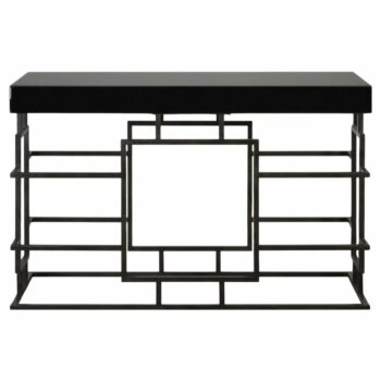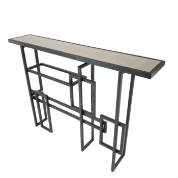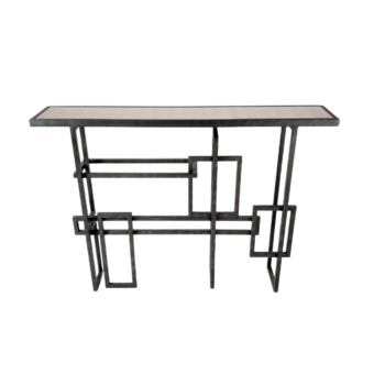 The Raebrook Console Table offers an industrial aesthetic with an elegant twist. It features soft white marble, beautifully veined with sand and grey, atop a minimalist gunmetal base. Its asymmetrical design not only provides visual interest and movement but also incorporates practical storage solutions.