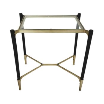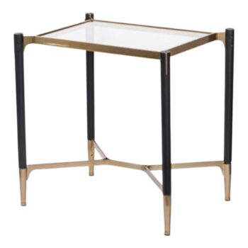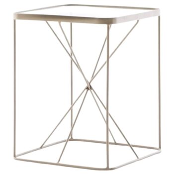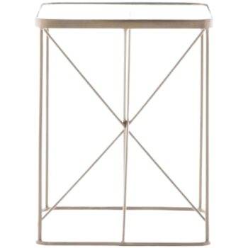 This glamorous end table marries minimalist modern design with Hollywood regency charm. Crafted from steel and finished in a luxurious gold metallic, it boasts a clean-lined open cube frame adorned with geometric detailing, embodying elegance and sophistication.