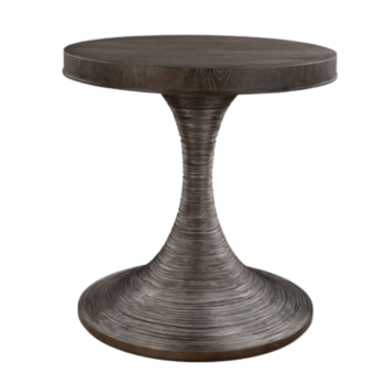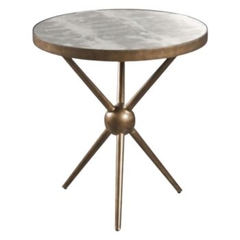The Seaforth End Table elegantly combines modern and classic elements, with a gracefully tapered pedestal and slim legs that hold up a resin faux shagreen top. Encased by a substantial iron band with an antique brass finish, this table seamlessly integrates contemporary design with a touch of timeless elegance.