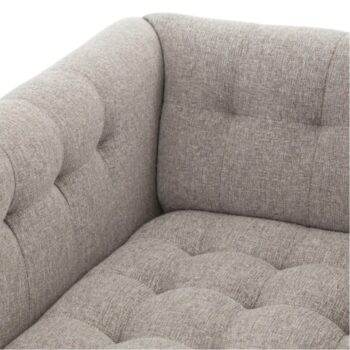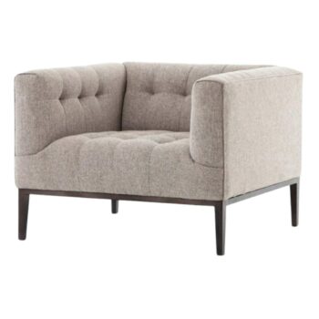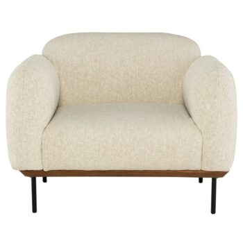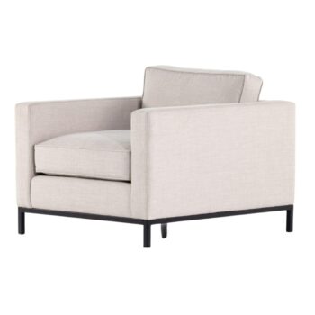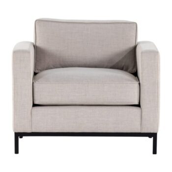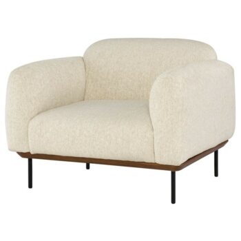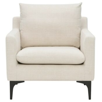 Indulge in the sleek elegance evocative of modern menswear with this crisply tailored accent chair. Upholstered in cream fabric, it boasts a soft yet structured aesthetic that adds sophistication to any space. The carbon-finished iron legs infuse a hint of modern industrialism, rounding out the contemporary appeal of this stylish piece.