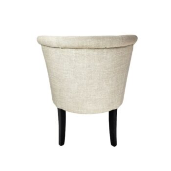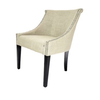 The Summers dining chair features a high back with a subtle hint of wings, bringing an elegant touch to the head of the table. Its natural-toned upholstery, highlighted by silver nailheads, complements the ebony wood legs, creating a sophisticated and stylish seating option.