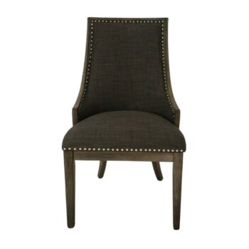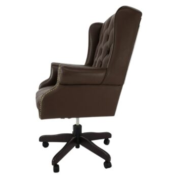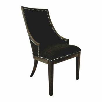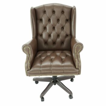 The Walter Desk Chair commands attention with its impressive scale, enveloped in plush caramel velvet and adorned with solid brass nailheads for added elegance. Its uniquely shaped frame is upholstered in deep chocolate faux leather, creating a striking contrast and a sense of luxury.