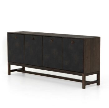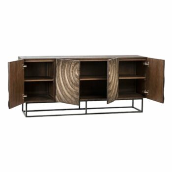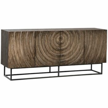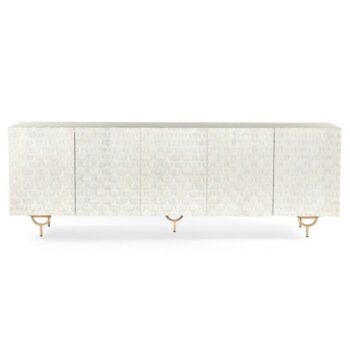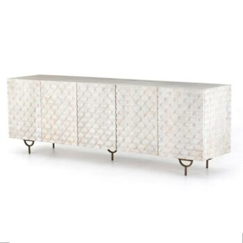 The Wilhelmina sideboard offers a globally inspired design with a delicate execution, making it a striking addition of character and texture to any room. Its cabinet doors feature an intricate fish scale motif that pairs seamlessly with the slender iron legs, ensuring it complements a wide range of interiors from traditional to contemporary. This piece embodies a perfect blend of craftsmanship and style, enhancing the aesthetic appeal of any space it occupies.