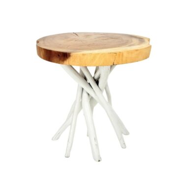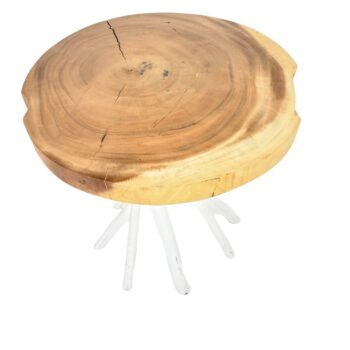 Mid-century meets modern industrial with natural live edge tabletops and metal legs. Each tabletop is unique due to the natural variations in acacia wood, with knots and cracks adding character.
