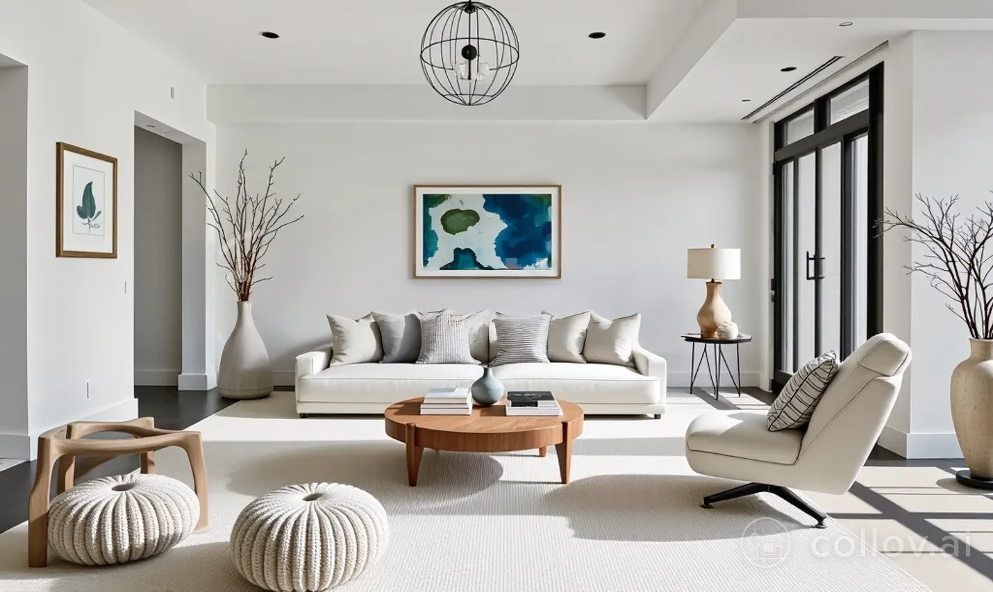 Same property as above, virtually staged on applydesign.io with “automatic” setting on. The scale of the furnishings is wrong and no use was made of the foreground, which forms a significant portion of the room.Also set on “automatic”, virtualstaging.ai had a weak inventory of “modern” furniture and produced a poor staging.Collov.ai produced by far the best and most usable result. However, the image has the hallmarks of being AI-generated: hotel room starkness with no soul. The biggest “tell” of AI is the cookie-cutter approach to accessorizing and the under-sizing of art — two elements that help introduce “soul” into a room.